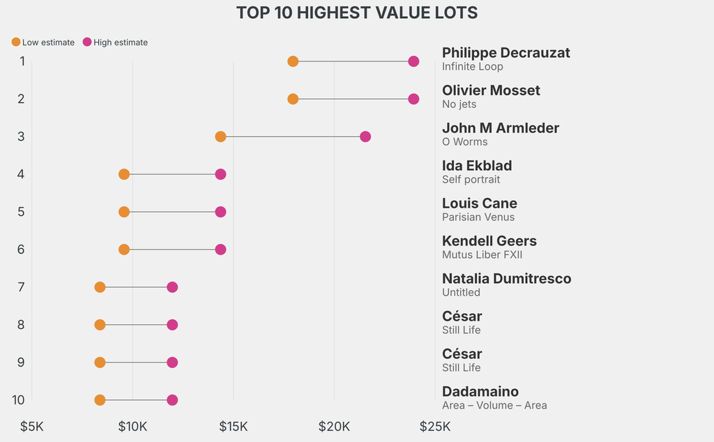 Philippe Decrauzat, Infinite Loop (2016), is estimated to sell for between $18,000 and $23,900. It has been traded once in the past.