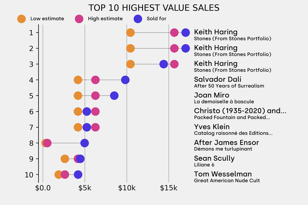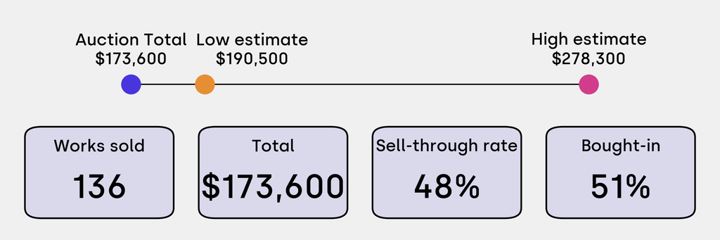 All results include the fees and premiums added to the price of a work of art when the auctioneer's hammer falls. Estimates, sale prices and totals are converted into US dollars. Sale prices are compared to the auction house’s low estimate, which do not include premiums.