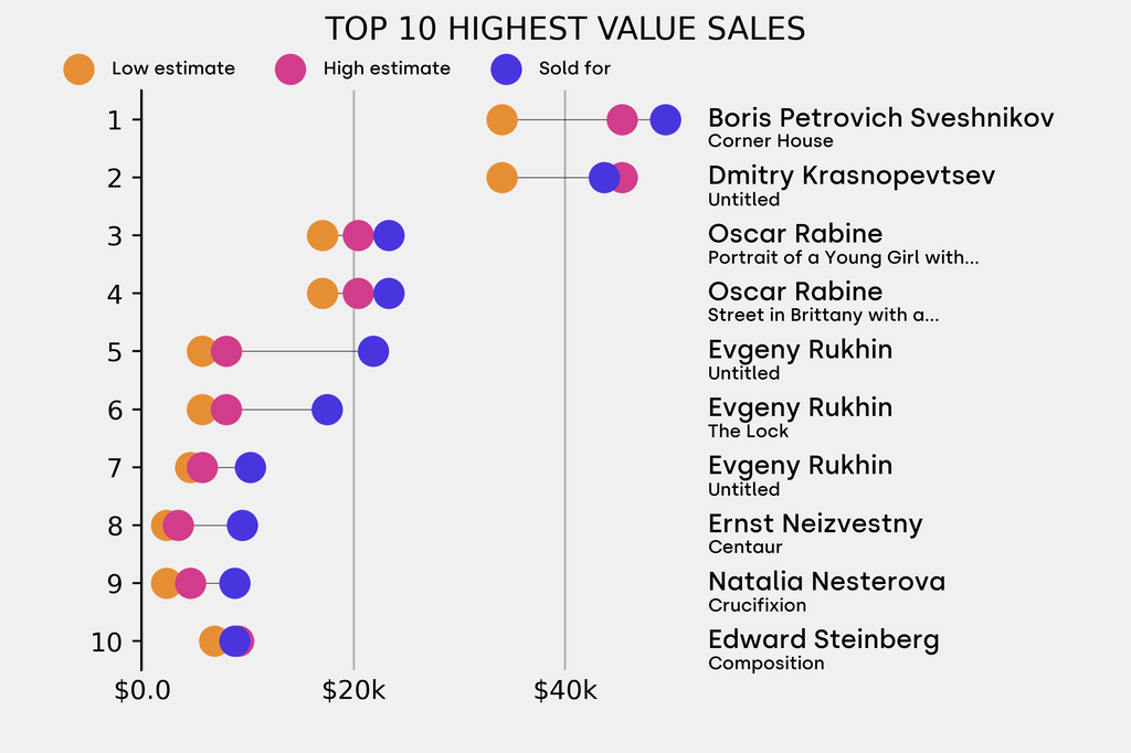 The star lot was: Boris Petrovich Sveshnikov, Corner House (1972), which sold for $49,500, 45% above its $34,000 low estimate. It has been traded once in the past.