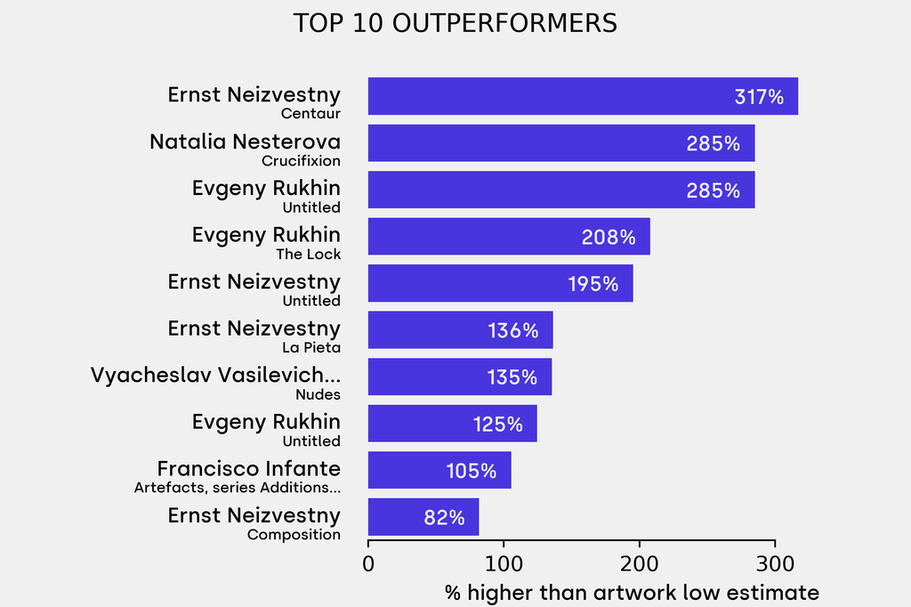 The outperformer sold for 317% above its low estimate. Ernst Neizvestny, Centaur (Undated), sold for $9,462 ($2,269 low estimate). It has been traded once in the past.