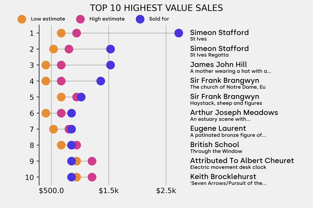 The star lot was: Simeon Stafford, St Ives (Undated), which sold for $2,720, 305% above its $671 low estimate.