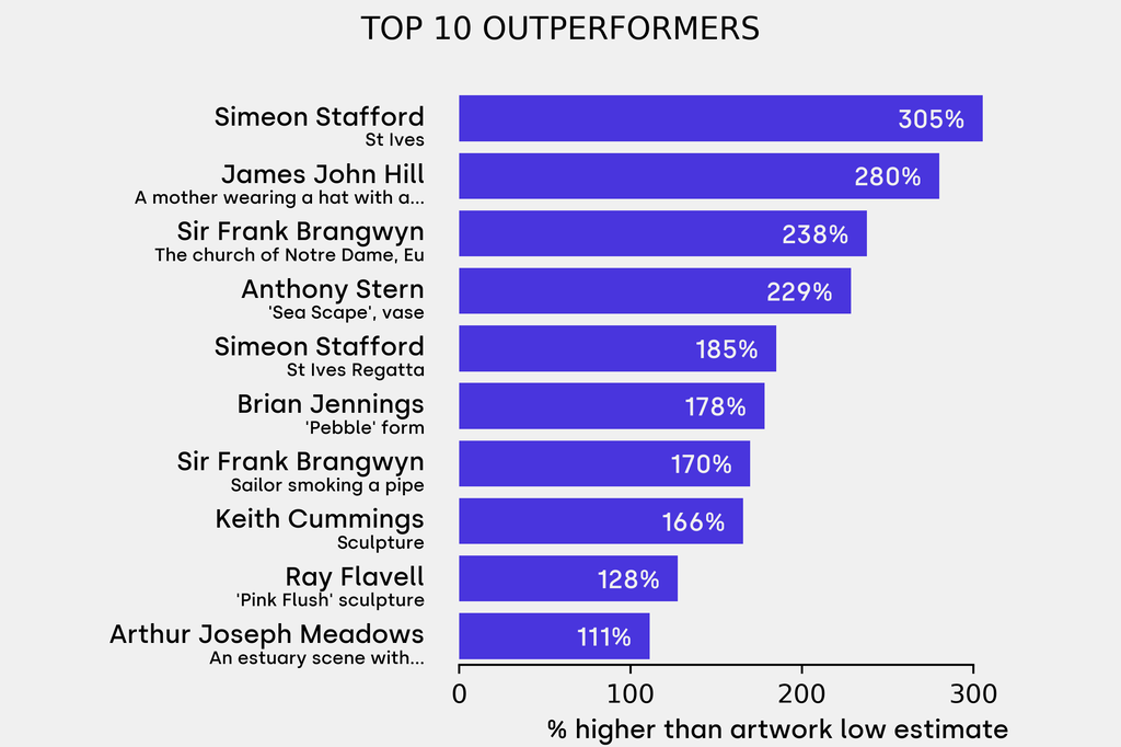 The outperformer sold for 305% above its low estimate. Simeon Stafford, St Ives (Undated), sold for $2,720 ($671 low estimate).