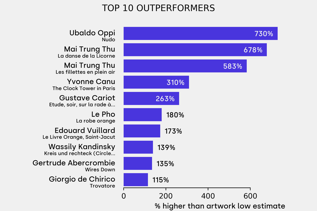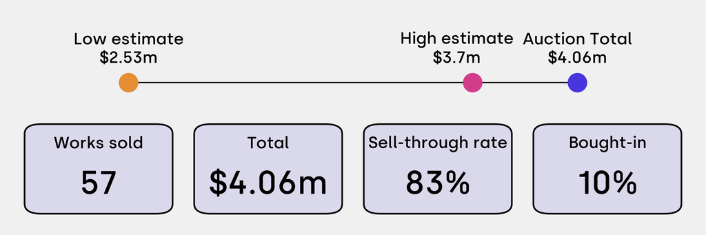 All results include the fees and premiums added to the price of a work of art when the auctioneer's hammer falls. Sale prices are compared to the auction house’s low estimate, which do not include premiums.