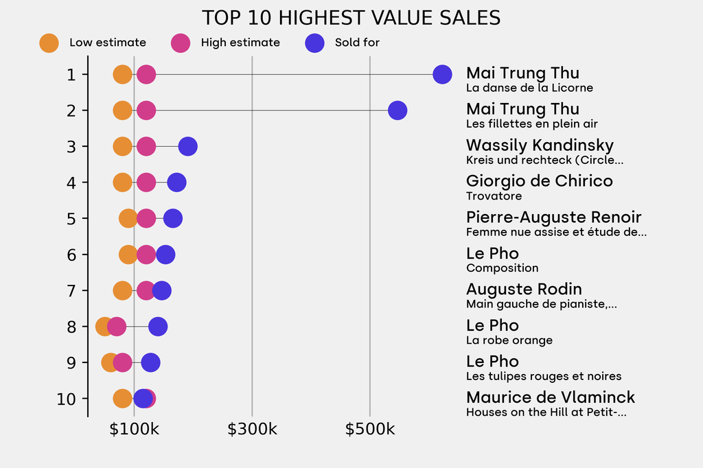 The star lot was: Mai Trung Thu, La danse de la Licorne (1964), which sold for $622,800, 678% above its $80,000 low estimate. It has been traded twice in the past.