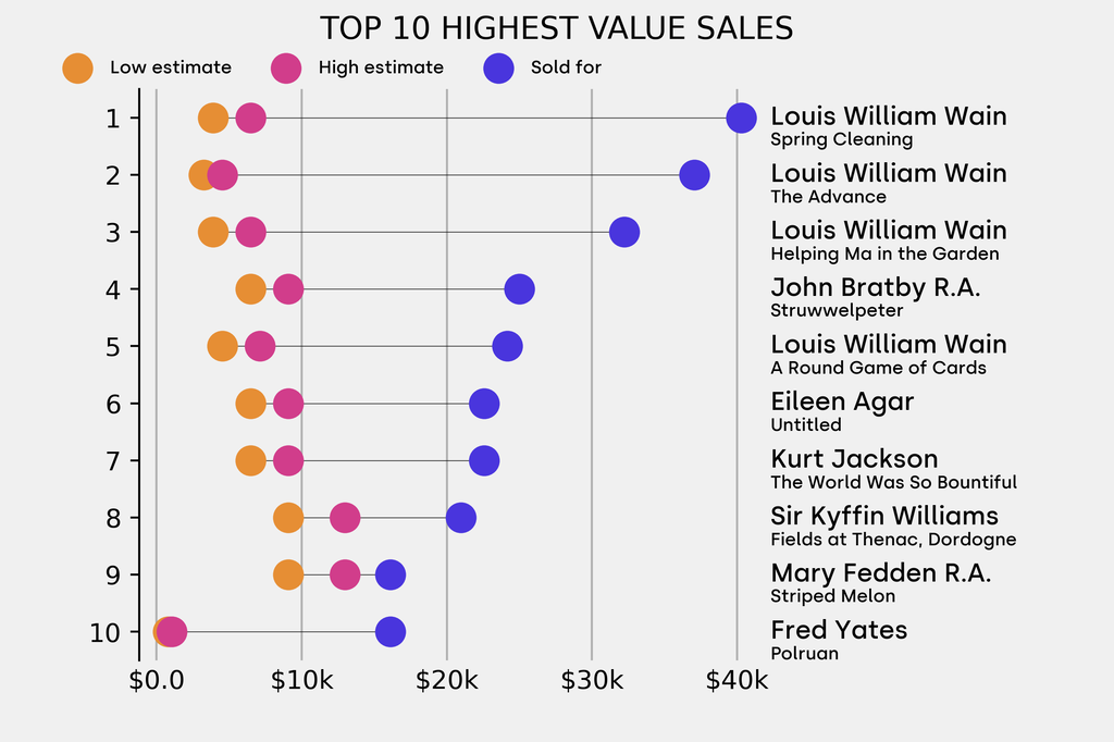 The star lot was: Louis William Wain, Spring Cleaning (Undated), which sold for $40,300, 936% above its $3,890 low estimate.