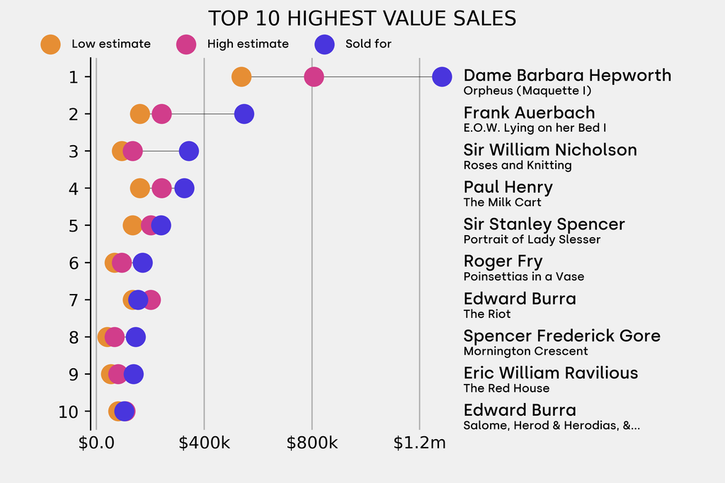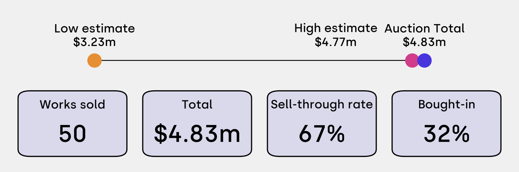 All results include the fees and premiums added to the price of a work of art when the auctioneer's hammer falls. Estimates, sale prices and totals are converted into US dollars. Sale prices are compared to the auction house’s low estimate, which do not include premiums.