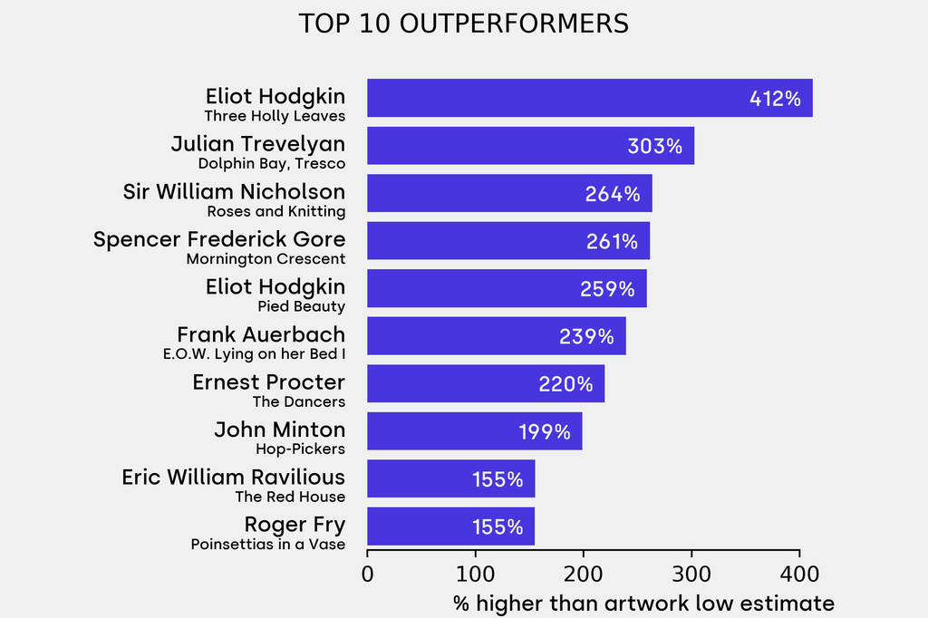 The outperformer sold for 412% above its low estimate. Eliot Hodgkin, Three Holly Leaves (1958), sold for $48,300 ($9,418 low estimate). It has been traded twice in the past.