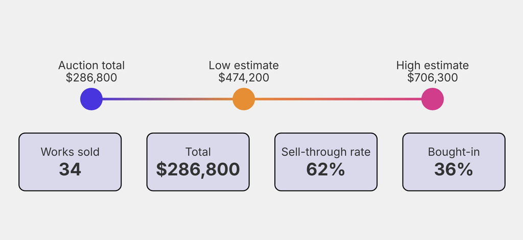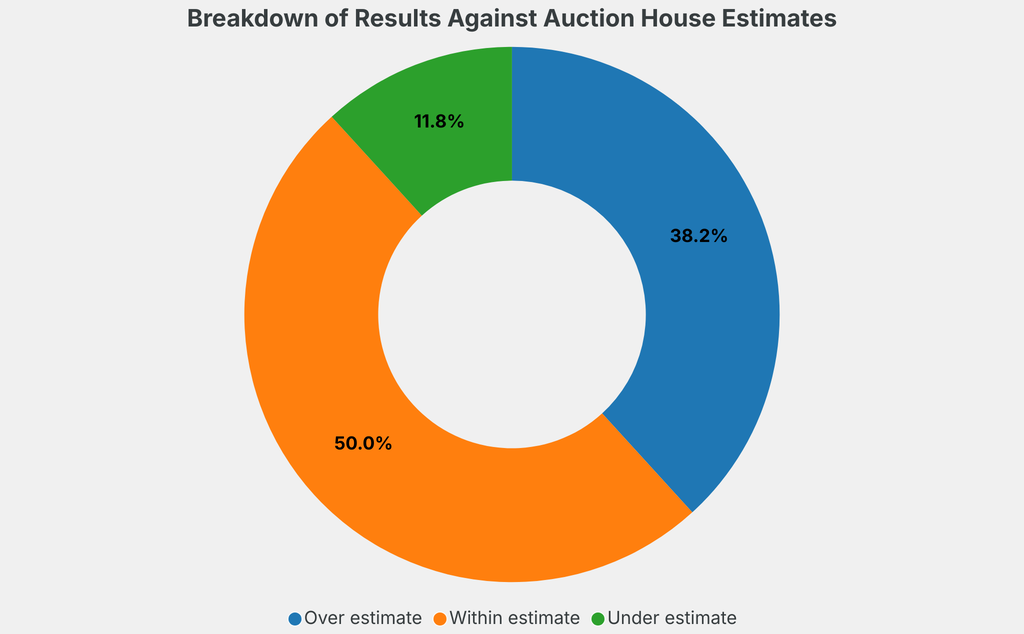 All results include the fees and premiums added to the price of a work of art when the auctioneer's hammer falls. Estimates, sale prices and totals are converted into US dollars. Sale prices are compared to the auction house’s low estimate, which do not include premiums.