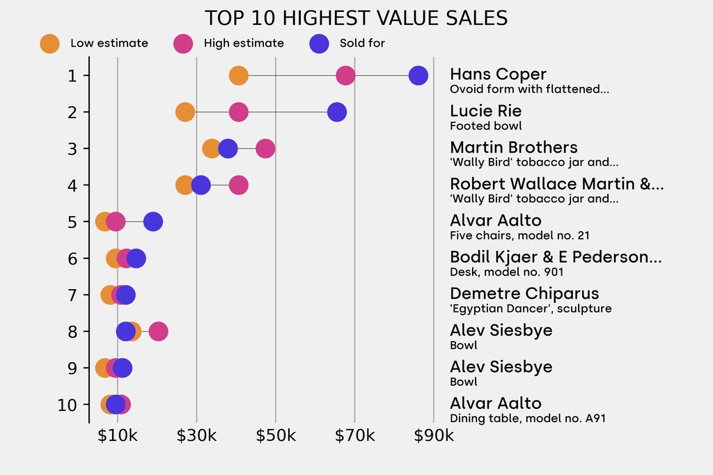 The star lot was: Hans Coper, Ovoid form with flattened cylinder (1966), which sold for $86,100, 111% above its $40,600 low estimate. It has been traded twice in the past.