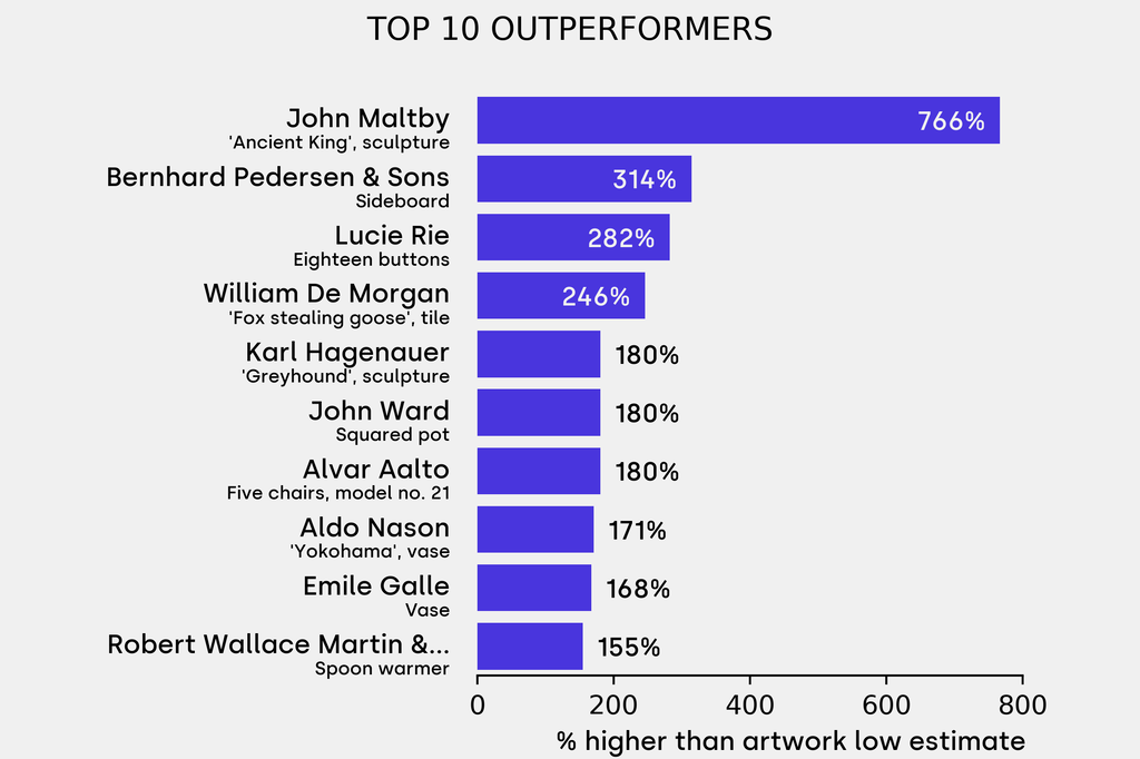 The outperformer sold for 766% above its low estimate. John Maltby, 'Ancient King', sculpture (Undated), sold for $5,861 ($677 low estimate).
