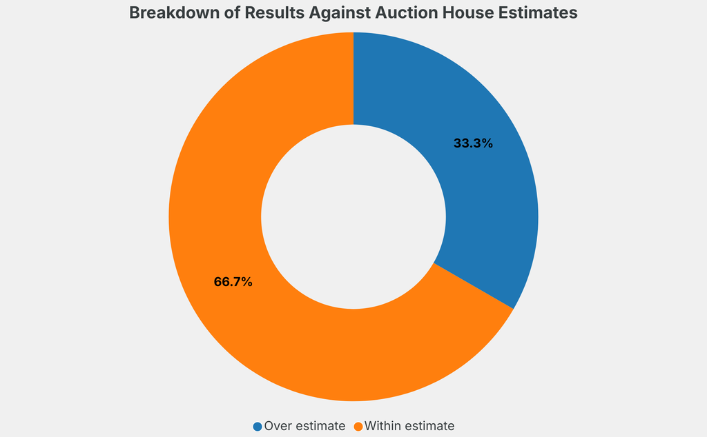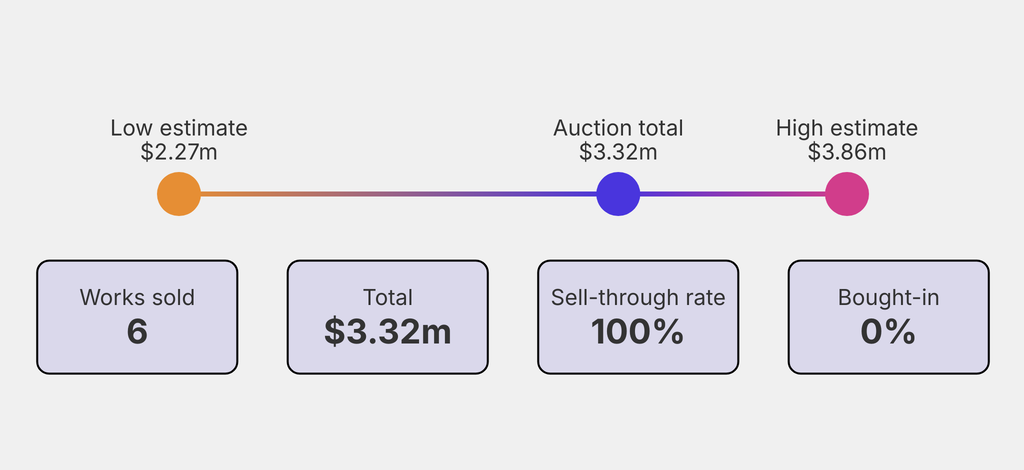 All results include the fees and premiums added to the price of a work of art when the auctioneer's hammer falls. Estimates, sale prices and totals are converted into US dollars. Sale prices are compared to the auction house’s low estimate, which do not include premiums.