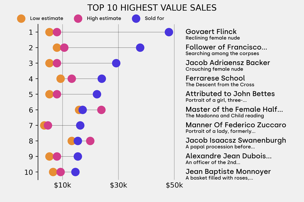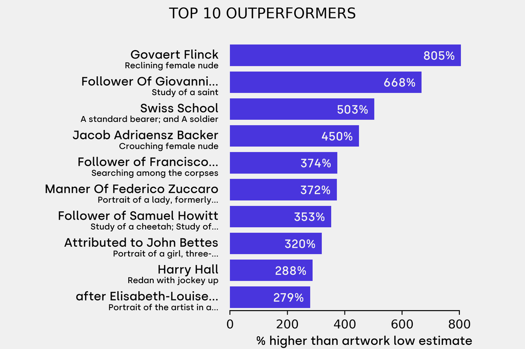 The outperformer sold for 805% above its low estimate. Govaert Flinck, Reclining female nude (Undated), sold for $48,000 ($5,306 low estimate). It has been traded once in the past.
