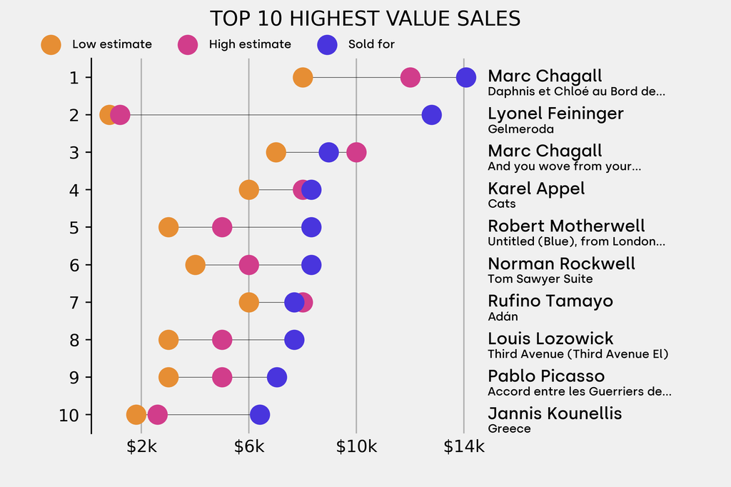 The star lot was: Marc Chagall, Daphnis et Chloé au Bord de la Fontaine, from Daphnis et Chloé (1961), which sold for $14,100, 76% above its $8,000 low estimate.
