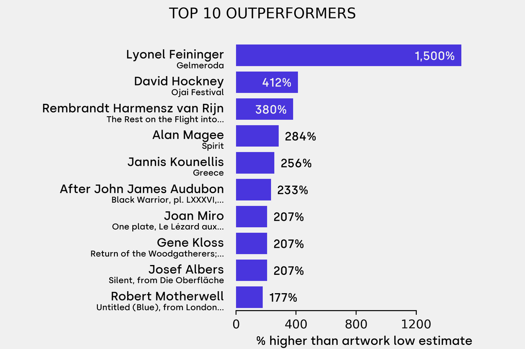 The outperformer sold for 1500% above its low estimate. Lyonel Feininger, *Gelmeroda * (1918), sold for $12,800 ($800 low estimate). It has been traded once in the past.