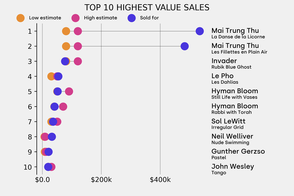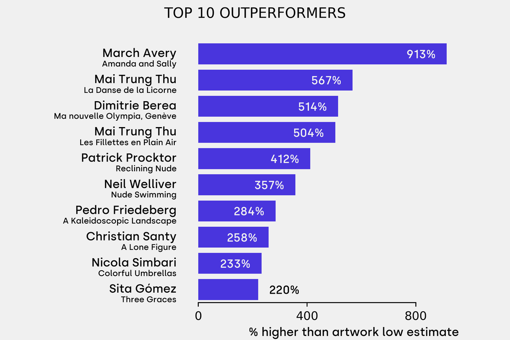 All results include the fees and premiums added to the price of a work of art when the auctioneer's hammer falls. Sale prices are compared to the auction house’s low estimate, which do not include premiums.