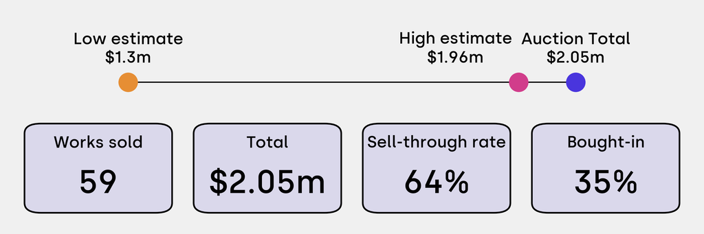 33 works were bought-in, including: Patrick Heron, Sharp Garden Painting (1985), estimated at $100,000 (low) to $150,000 (high). It has been traded 3 times in the past.