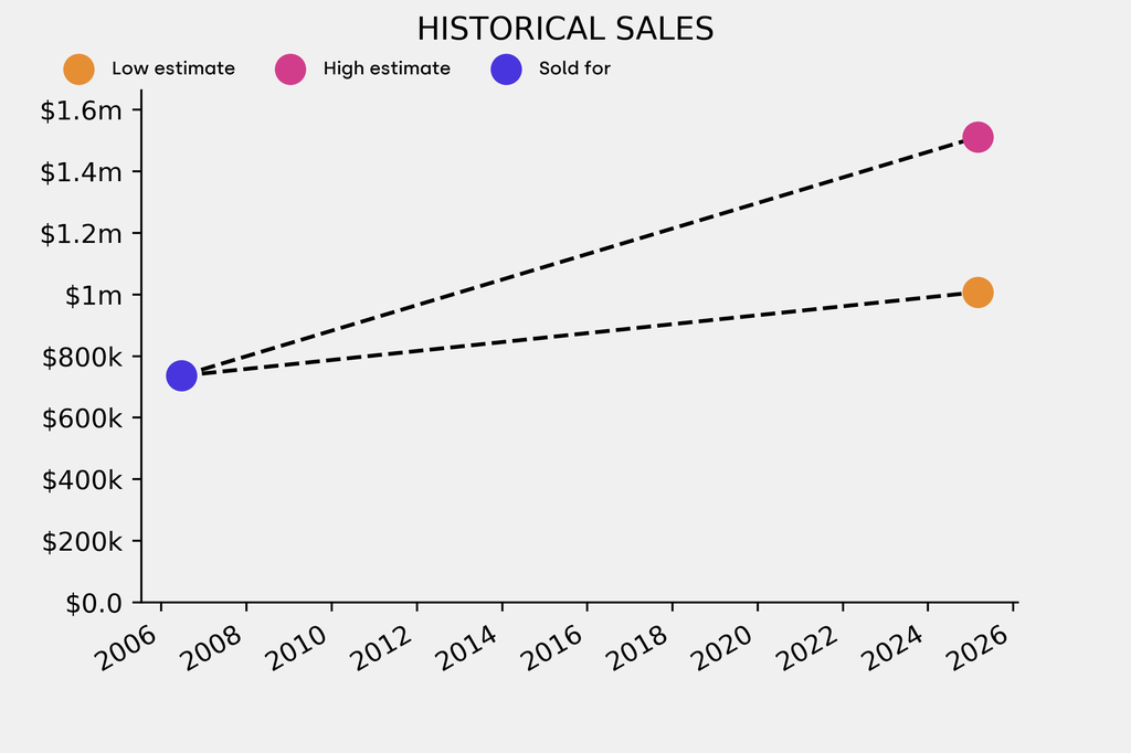 It last sold at auction in 2006 for $735,900 at Christie's. This is $271,900 less than its new low estimate. If it sells for more than the low estimate on March 5, 2025 it could realize a 1% annualized return. Oil On Canvas, 50.7 x 40.5cm. The work has been traded 5 times in the past.