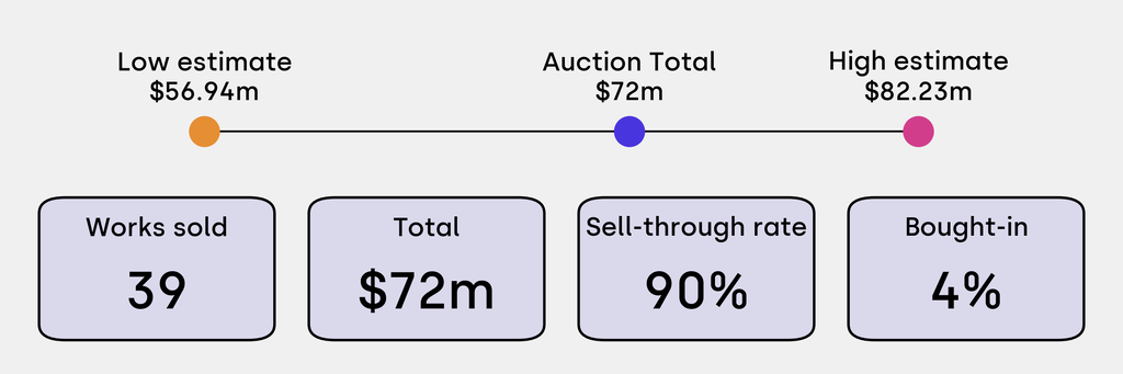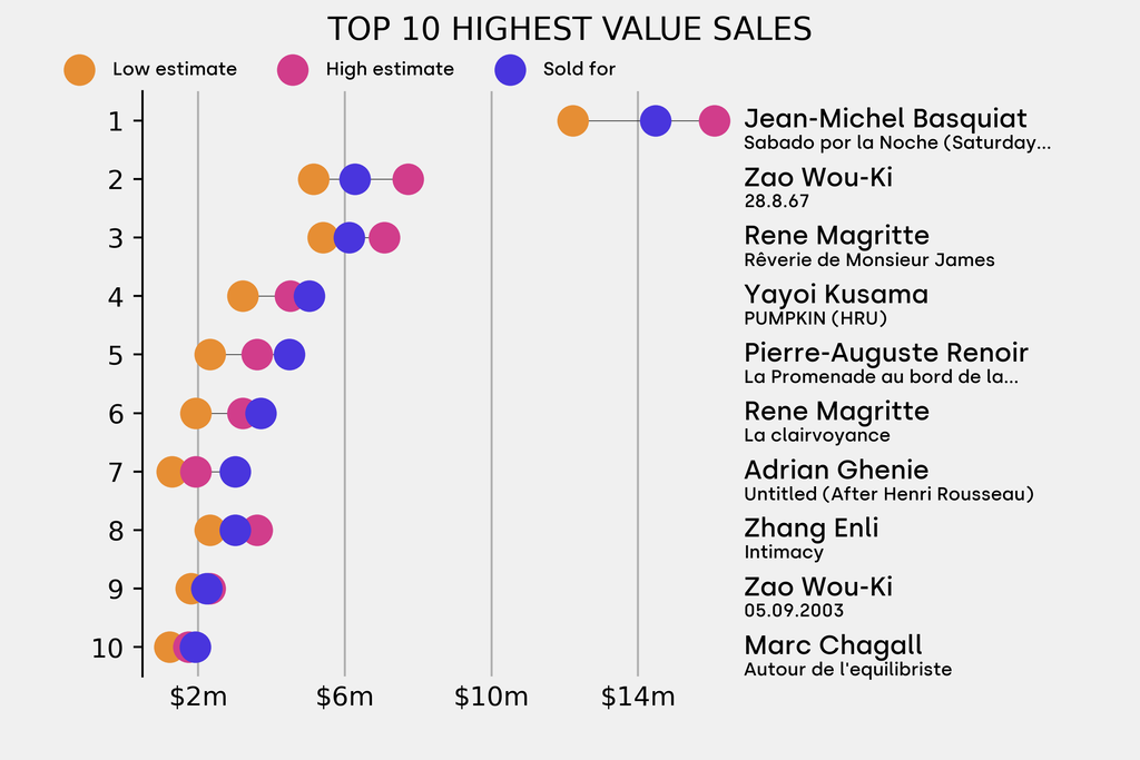 All results include the fees and premiums added to the price of a work of art when the auctioneer's hammer falls. Estimates, sale prices and totals are converted into US dollars. Sale prices are compared to the auction house’s low estimate, which do not include premiums.