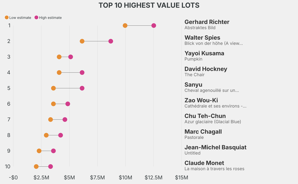 The highest-value lot announced is: Gerhard Richter, Abstraktes Bild (1991), which is estimated to sell for between $9.96m and $12.52m. The work is backed by a guarantee. It has been traded twice in the past.