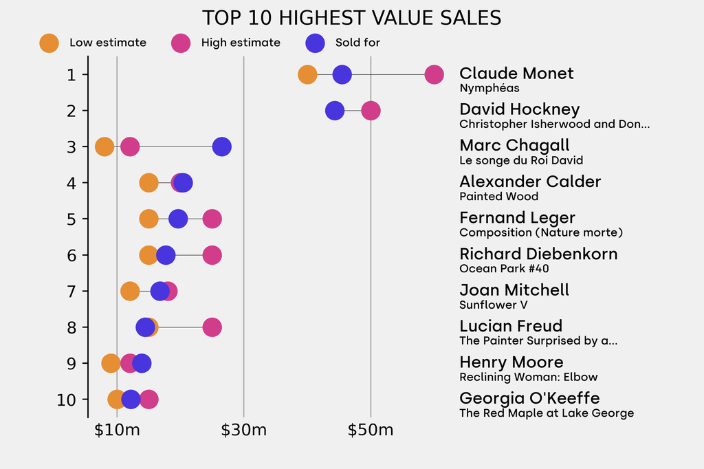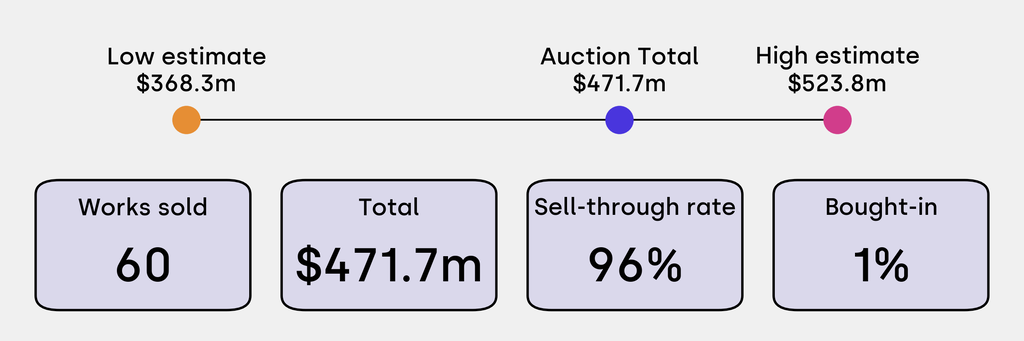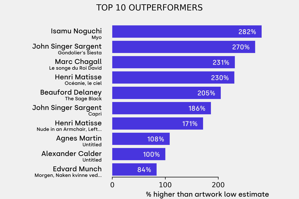 All results include the fees and premiums added to the price of a work of art when the auctioneer's hammer falls. Sale prices are compared to the auction house’s low estimate, which do not include premiums.
