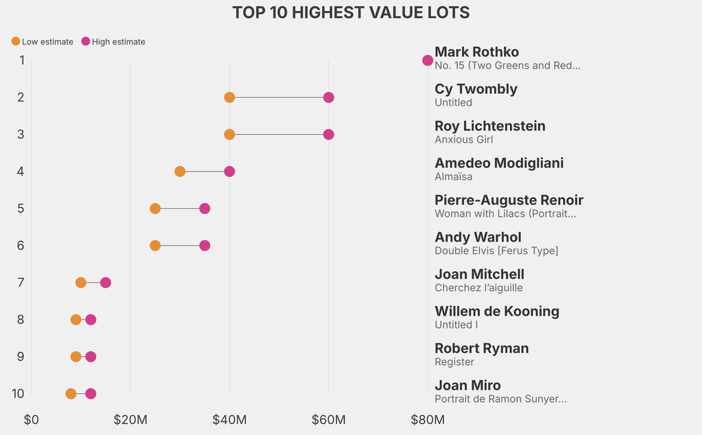 The highest-value lot announced is: Mark Rothko, No. 15 (Two Greens and Red Stripe) (1964), which is estimated to sell for around $80m. The work is backed by a guarantee. It has not been traded before.