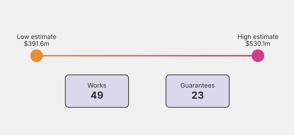 23 works are backed by guarantees, including: Roy Lichtenstein, Anxious Girl (1964). It is estimated to sell for between $40m and $60m. It has been traded 5 times in the past.