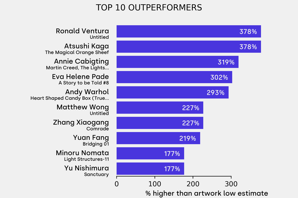 The outperformer sold for 377% above its low estimate. Ronald Ventura, Untitled (2011), sold for $61,500 ($12,900 low estimate). It has not been traded before.