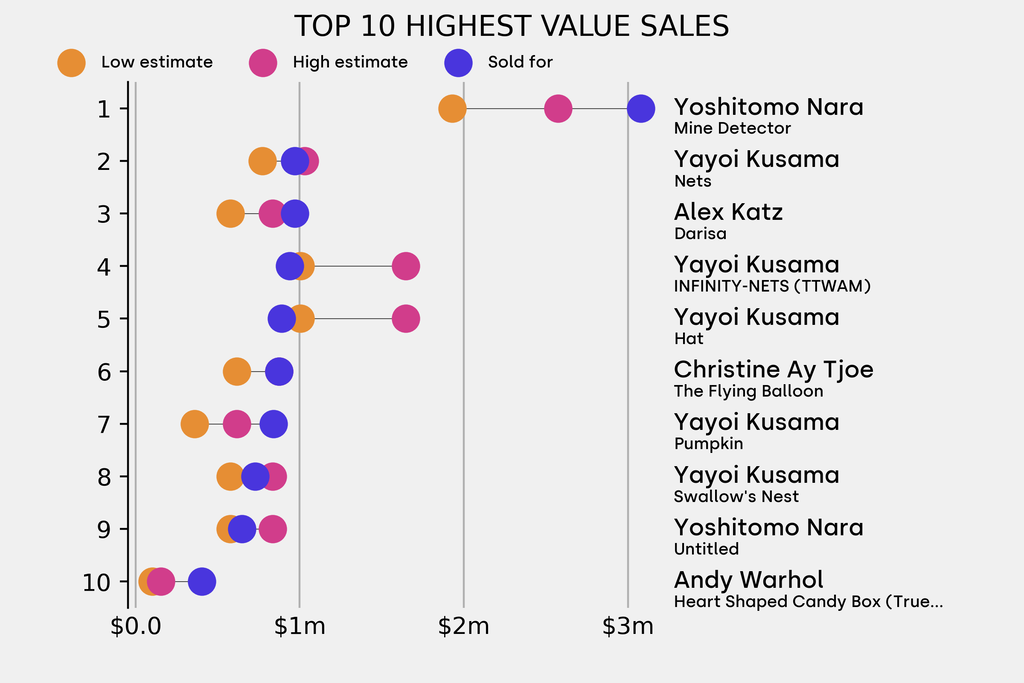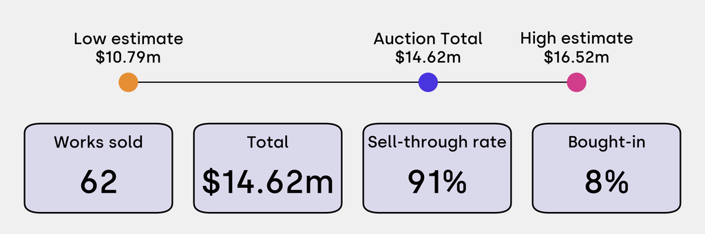 All results include the fees and premiums added to the price of a work of art when the auctioneer's hammer falls. Estimates, sale prices and totals are converted into US dollars. Sale prices are compared to the auction house’s low estimate, which do not include premiums.