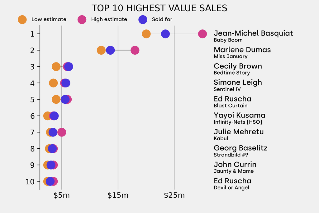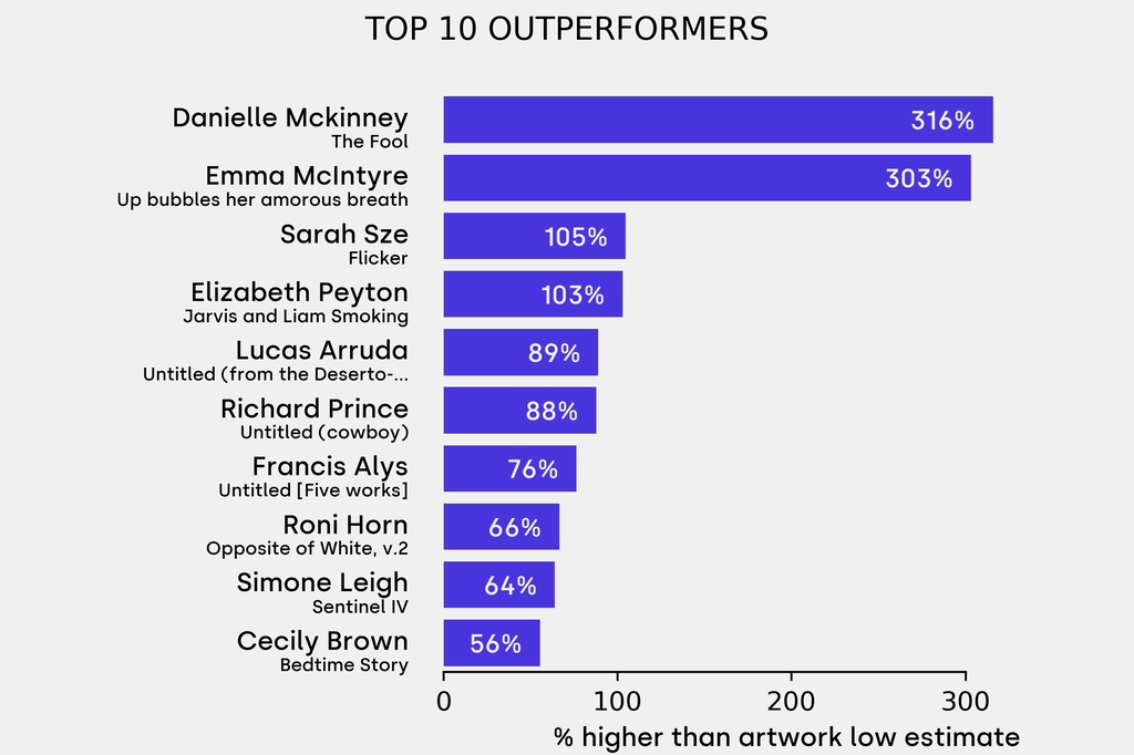 All results include the fees and premiums added to the price of a work of art when the auctioneer's hammer falls. Sale prices are compared to the auction house’s low estimate, which do not include premiums.