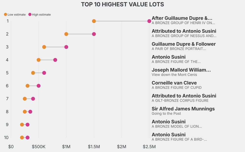 The highest-value lot announced is: After Guillaume Dupre & After Barthelemy Prieur, A BRONZE GROUP OF HENRI IV ON HORSEBACK (1610), which is estimated to sell for between $1.5m and $2.5m. It has been traded once in the past.