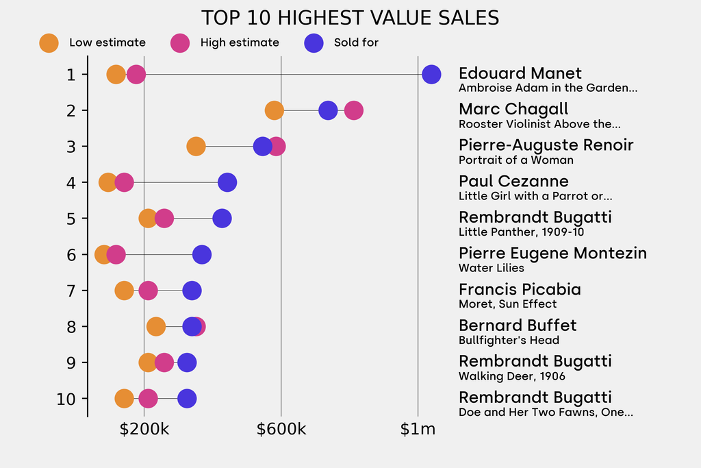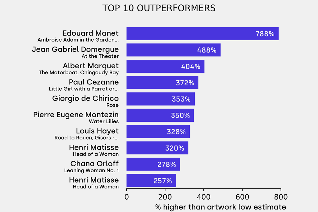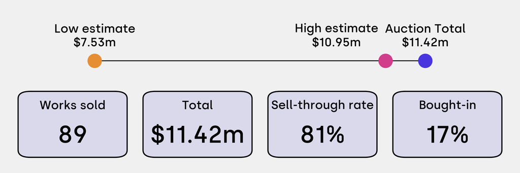 All results include the fees and premiums added to the price of a work of art when the auctioneer's hammer falls. Estimates, sale prices and totals are converted into US dollars. Sale prices are compared to the auction house’s low estimate, which do not include premiums.