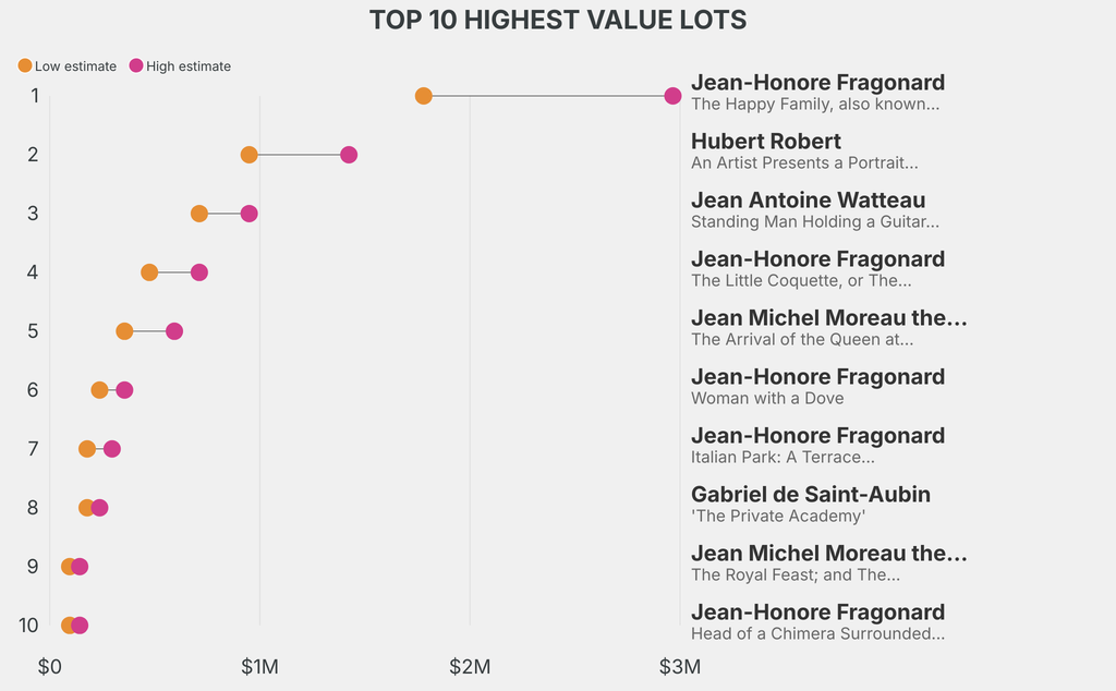 The highest-value lot announced is: Jean-Honore Fragonard, The Happy Family, also known as Young Couple Contemplating a Sleeping Child, or The Return Home, or The Reconciliation (Undated), which is estimated to sell for between $1.78m and $2.97m. It has not been traded before.