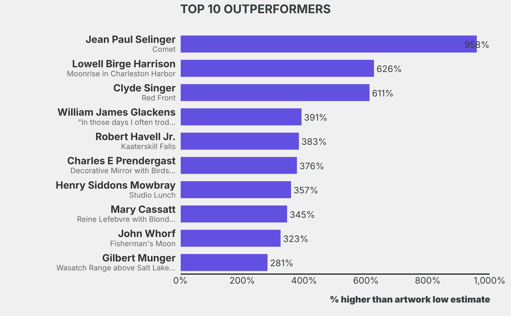 The outperformer sold for 958% above its low estimate. Jean Paul Selinger, Comet (Undated), sold for $63,500 ($6,000 low estimate). It has been traded 3 times in the past.