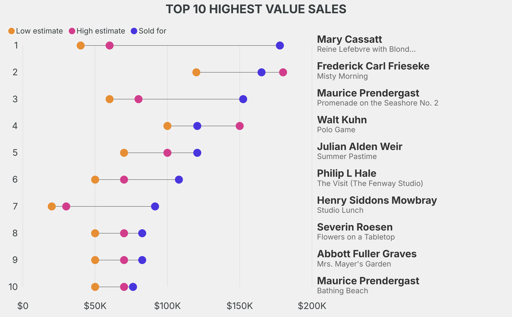 The star lot was: Mary Cassatt, Reine Lefebvre with Blond Baby and Sara Holding a Cat (1905), which sold for $177,800, 344% above its $40,000 low estimate. It has been traded 4 times in the past.