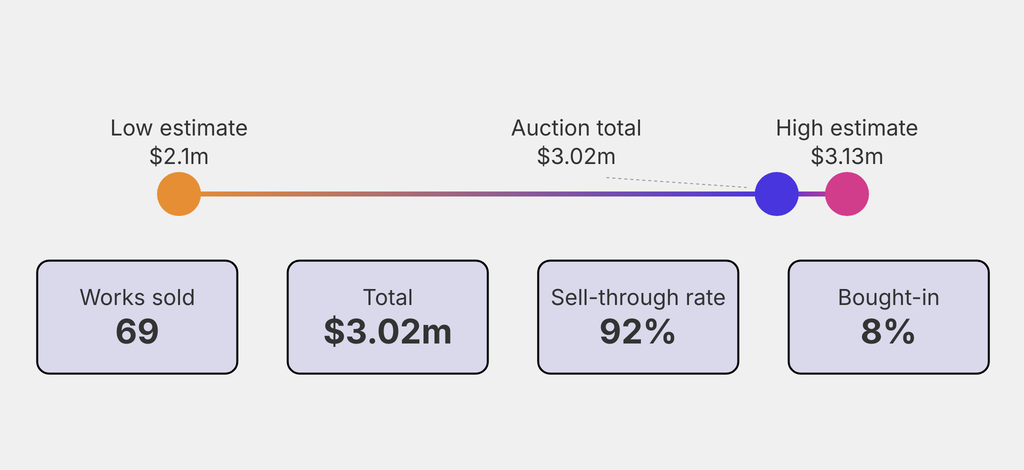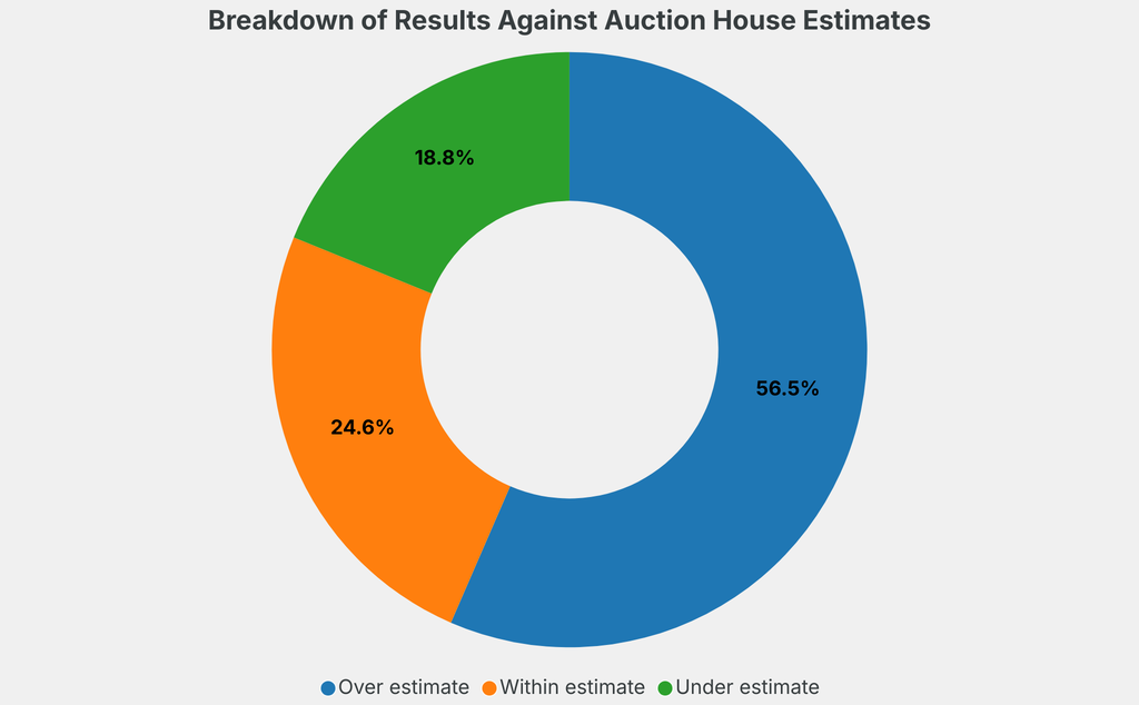 All results include the fees and premiums added to the price of a work of art when the auctioneer's hammer falls. Sale prices are compared to the auction house’s low estimate, which do not include premiums.