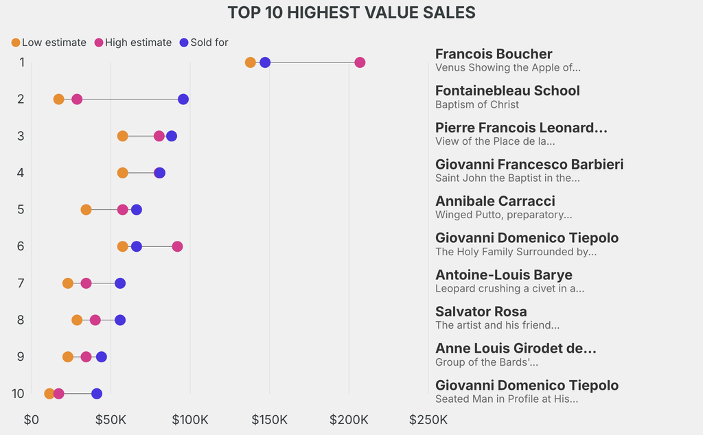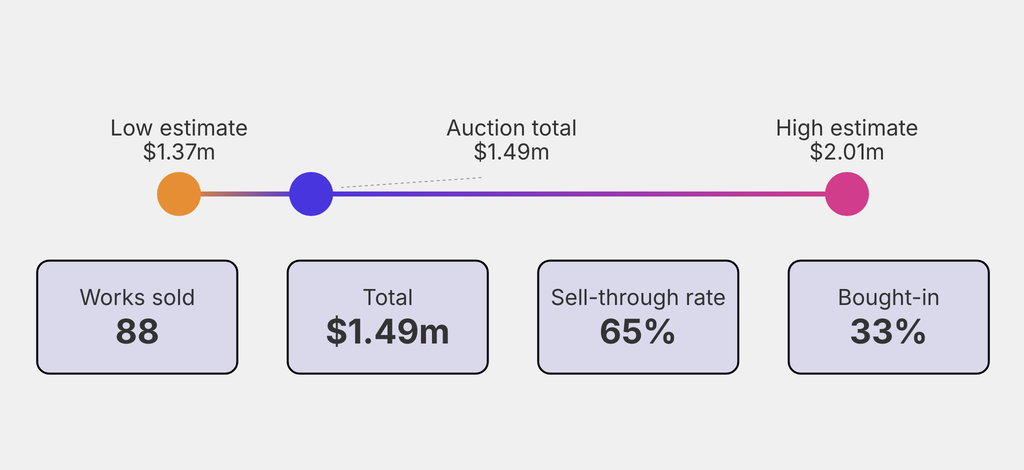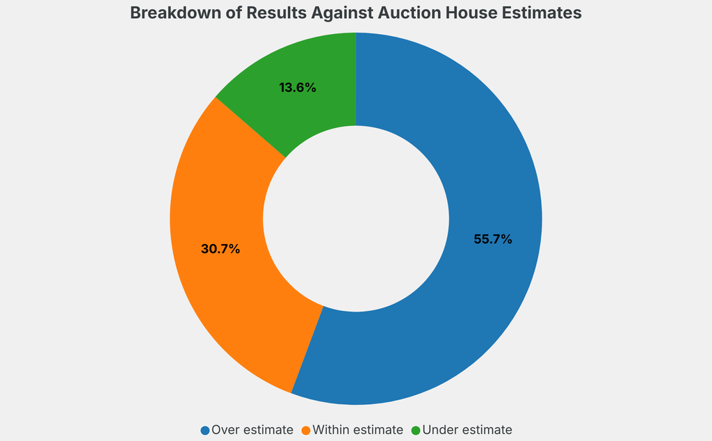 All results include the fees and premiums added to the price of a work of art when the auctioneer's hammer falls. Estimates, sale prices and totals are converted into US dollars. Sale prices are compared to the auction house’s low estimate, which do not include premiums.
