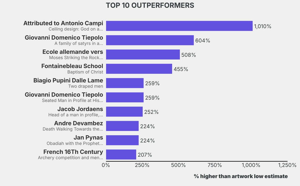The outperformer sold for 1009% above its low estimate. Attributed to Antonio Campi, Ceiling design: God on a chariot drawn by two horses (Undated), sold for $19,100 ($1,724 low estimate). It has been traded twice in the past.