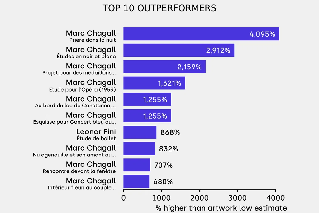 The outperformer sold for 4094% above its low estimate. Marc Chagall, Prière dans la nuit (1935), sold for $21,100 ($504 low estimate). It has not been traded before.