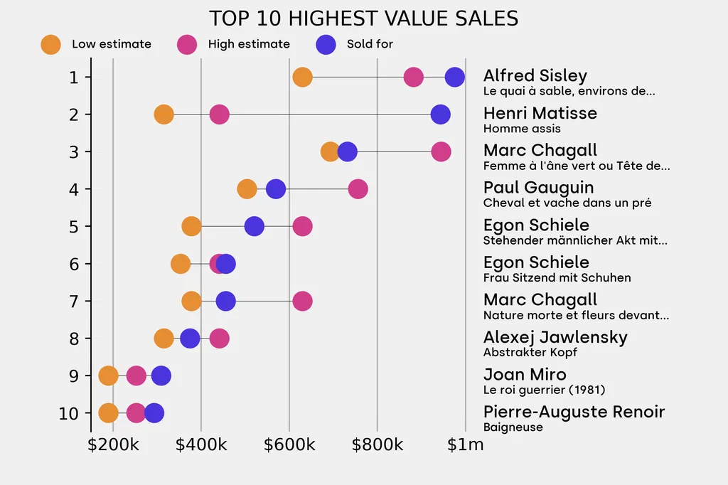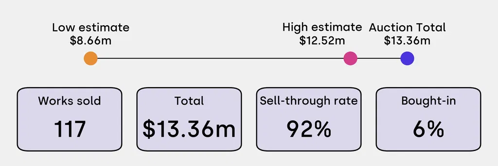 All results include the fees and premiums added to the price of a work of art when the auctioneer's hammer falls. Estimates, sale prices and totals are converted into US dollars. Sale prices are compared to the auction house’s low estimate, which do not include premiums.