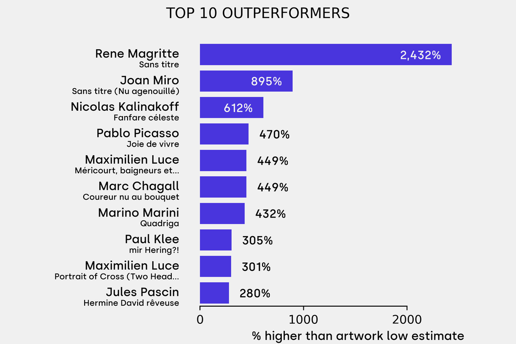 The outperformer sold for 2432% above its low estimate. Rene Magritte, Sans titre (1919), sold for $68,300 ($2,697 low estimate). It has been traded twice in the past.
