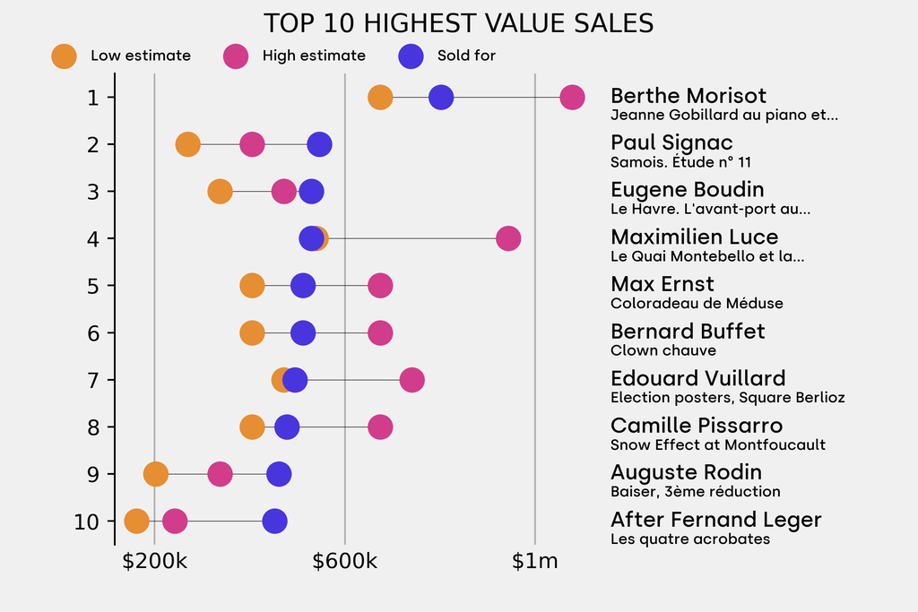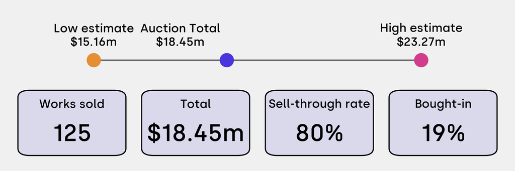 All results include the fees and premiums added to the price of a work of art when the auctioneer's hammer falls. Estimates, sale prices and totals are converted into US dollars. Sale prices are compared to the auction house’s low estimate, which do not include premiums.
