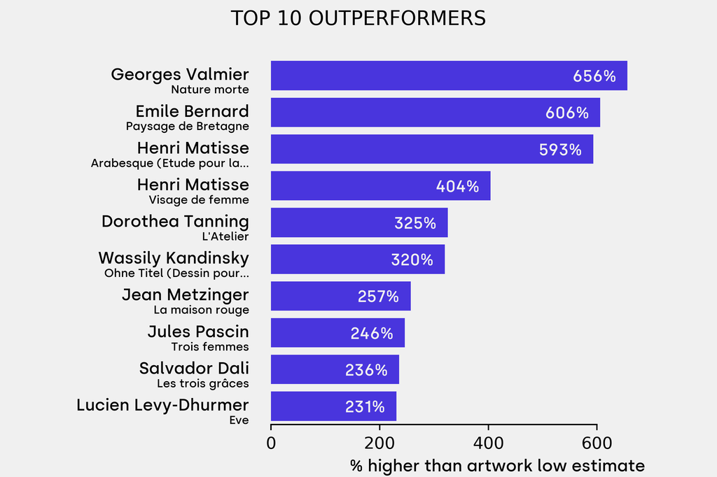 The outperformer sold for 656% above its low estimate. Georges Valmier, Nature morte (1919), sold for $22,700 ($3,000 low estimate). It has been traded twice in the past.