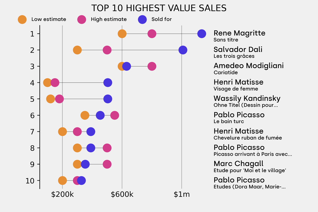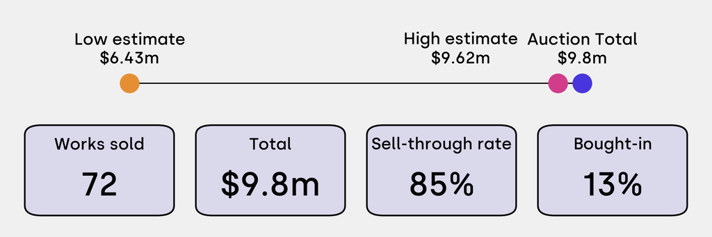 All results include the fees and premiums added to the price of a work of art when the auctioneer's hammer falls. Sale prices are compared to the auction house’s low estimate, which do not include premiums.