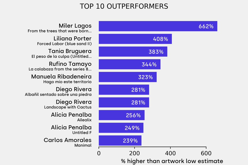 23 works were bought-in, including: Alice Rahon, Rocío y manchas solares (1976), estimated at $50,000 (low) to $70,000 (high). It has been traded 3 times in the past.