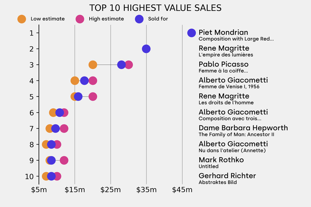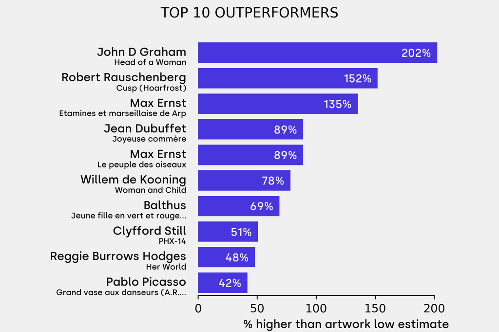 All results include the fees and premiums added to the price of a work of art when the auctioneer's hammer falls. Sale prices are compared to the auction house’s low estimate, which do not include premiums.