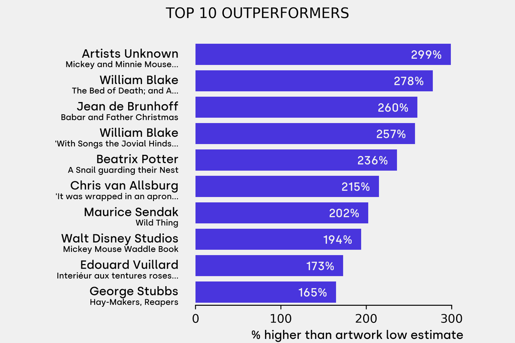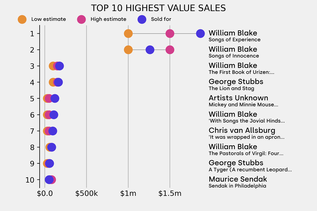 10 works were bought-in, including: William Blake, Oberon and Titania on a Lily (Undated), estimated at $400,000 (low) to $600,000 (high). It has been traded 5 times in the past.