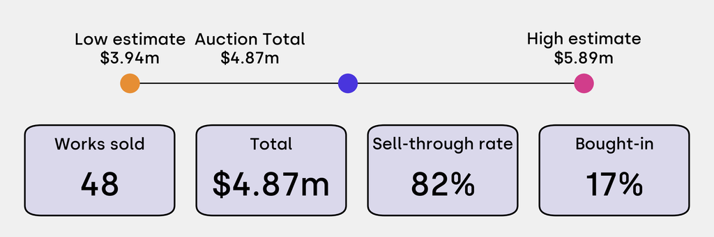 All results include the fees and premiums added to the price of a work of art when the auctioneer's hammer falls. Sale prices are compared to the auction house’s low estimate, which do not include premiums.