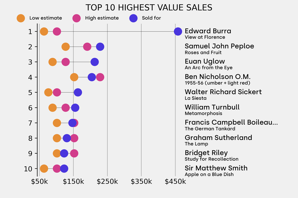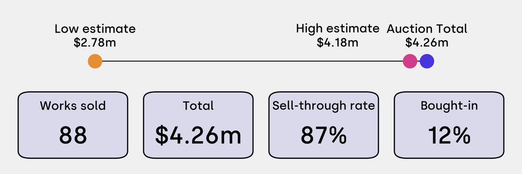 All results include the fees and premiums added to the price of a work of art when the auctioneer's hammer falls. Estimates, sale prices and totals are converted into US dollars. Sale prices are compared to the auction house’s low estimate, which do not include premiums.