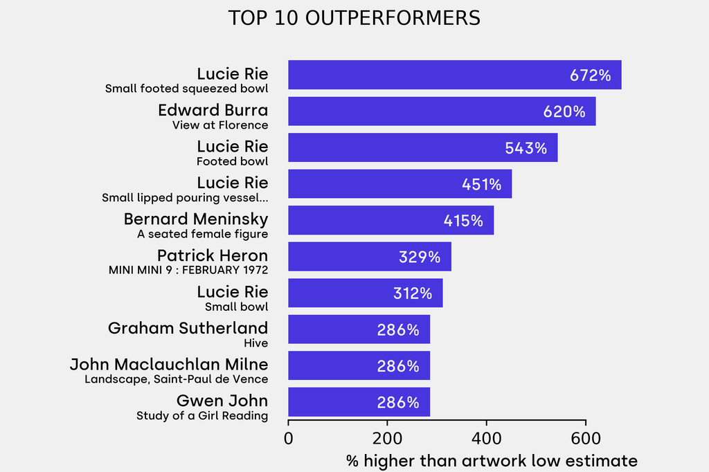 The outperformer sold for 671% above its low estimate. Lucie Rie, Small footed squeezed bowl (Undated), sold for $19,600 ($2,540 low estimate). It has not been traded before.