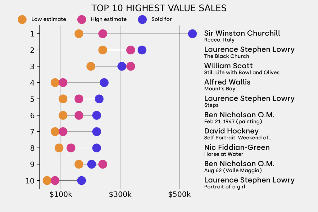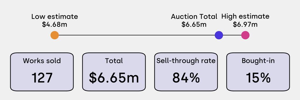 All results include the fees and premiums added to the price of a work of art when the auctioneer's hammer falls. Estimates, sale prices and totals are converted into US dollars. Sale prices are compared to the auction house’s low estimate, which do not include premiums.